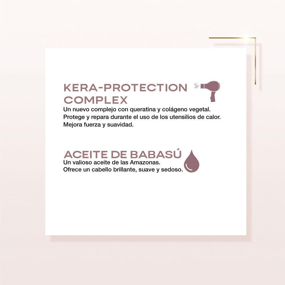 - Kera-Protection Complex: complejo a base de queratina y colágeno vegetal que protege durante el uso de los utensilios de calor, repara el cabello dañado y mejora su fuerza y suavidad.