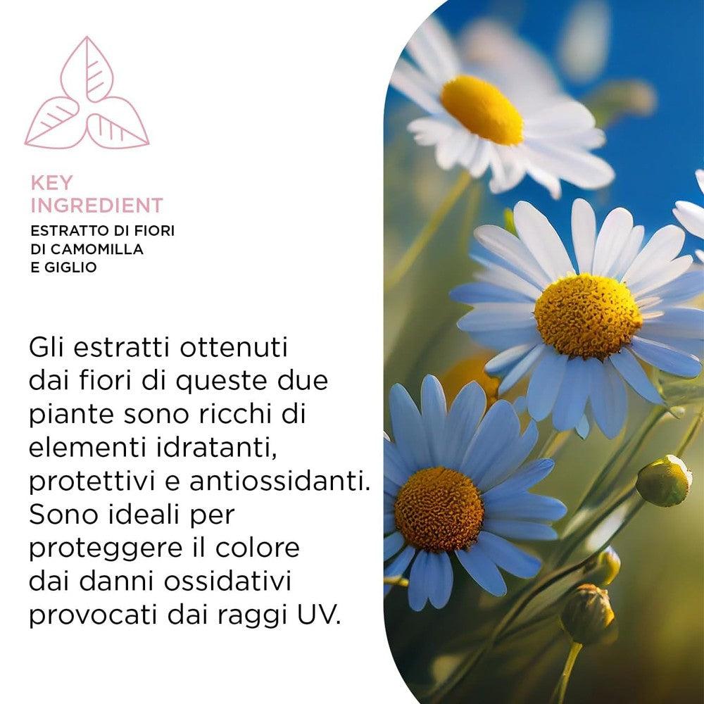 - Extracto de manzanilla y flor de lirio: plantas ricas en elementos hidratantes, protectores y antioxidantes. Por esta razón, su formulación es ideal para proteger el color del daño oxidativo causado por los rayos UV.